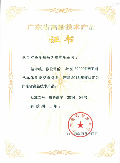 資質(zhì)榮譽您當前位置: 首頁 > 關于JNS > 資質(zhì)榮譽 > 《39000DWT綠色環(huán)保靈便型散貨船》 被認定為廣東省高新技術產(chǎn)品