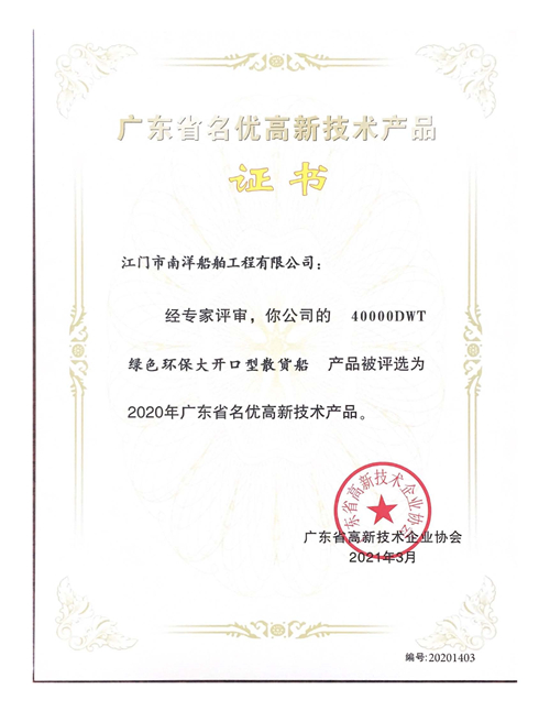 資質(zhì)榮譽您當(dāng)前位置: 首頁 > 關(guān)于JNS > 資質(zhì)榮譽 > 《40000DWT綠色環(huán)保大開口型散貨船》 被認(rèn)定為廣東省名優(yōu)高新技術(shù)產(chǎn)品