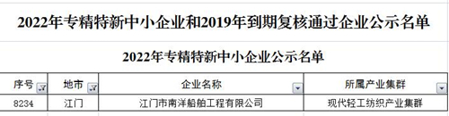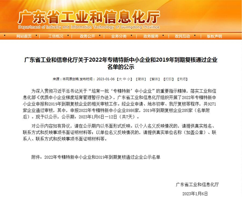 1月6日廣東省工業(yè)與信息化廳發(fā)布了《關(guān)于2022年專精特新中小企業(yè)和2019年到期復(fù)核通過企業(yè)名單的公示》,我司成功入選“2022年廣東省專精特新中小企業(yè)”。